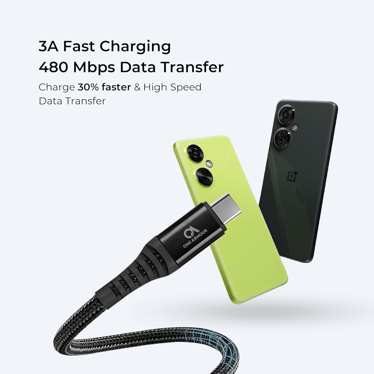 Onearmour USB A to Type C Data Cable Compatible for All Devices (Black/White/Grey)